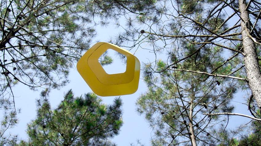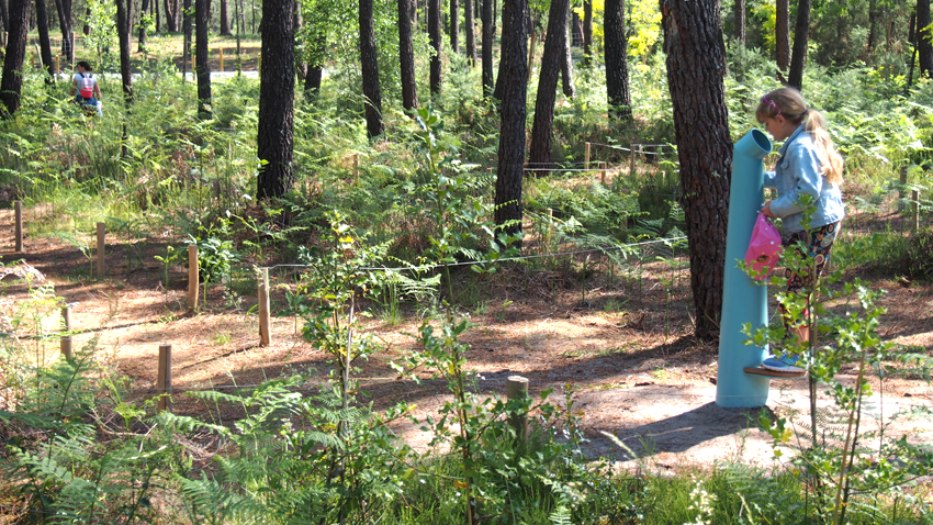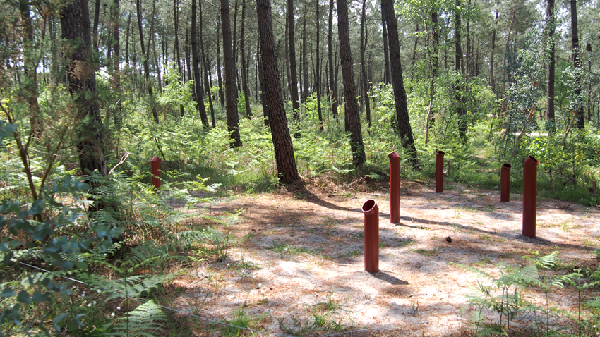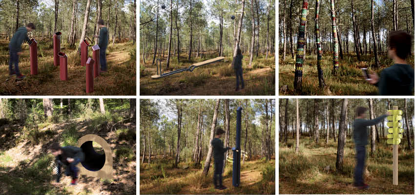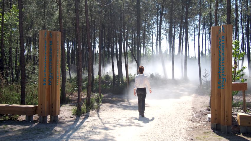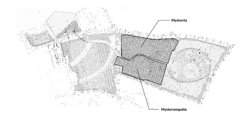- Labyrinthe Mysterrenquête. Composé de 8 chambres creusées dans le sol, le labyrinthe se présente comme une balade. Chaque chambre propose une énigme numérique à résoudre afin de récolter les indices nécessaires à la résolution de l'enquête. Ici pas d'interaction directe entre les installations et le contenu numériques. Les miroirs, discrète présence dans cet univers forestier, habillent les chambres, incitent à des jeux visuels et poétiques.