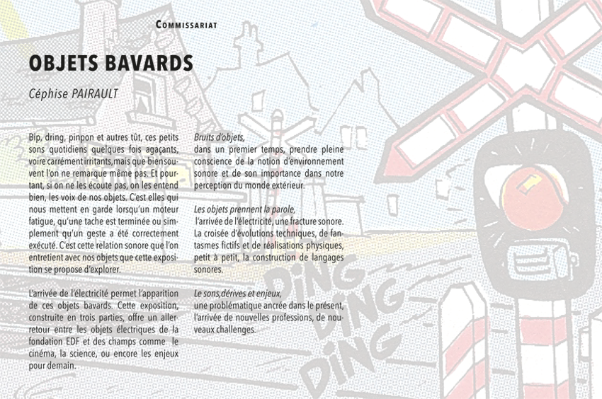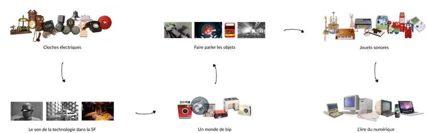 - Développé de la deuxième partie: les objets prennent la parole. L'arrivée progressive des objets électriques sonores mise en parallèle avec les débuts de la musique électronique, les univers sonores de la science fiction, la quête de la synthèse vocale ou encore le monde des jouets acoustiques