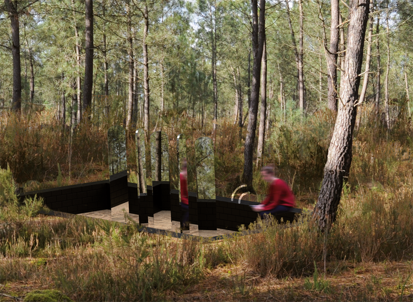 - Labyrinthe Mysterrenquête. Composé de 8 chambres creusées dans le sol, le labyrinthe se présente comme une balade. Chaque chambre propose une énigme numérique à résoudre afin de récolter les indices nécessaires à la résolution de l'enquête. Ici pas d'interaction directe entre les installations et le contenu numériques. Les miroirs, discrète présence dans cet univers forestier, habillent les chambres, incitent à des jeux visuels et poétiques.