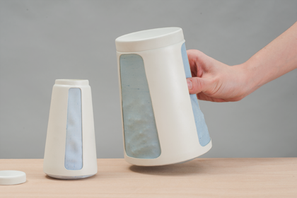 Mô est une gamme d'objets acceuillant des aliments composés de parties souples. Un jeu avec une nouvelle matière, un rapport plus sensible aux objets qui permet de fluidifier les mouvements dans la cuisine et ainsi d'en faciliter l'accès aux malvoyants.