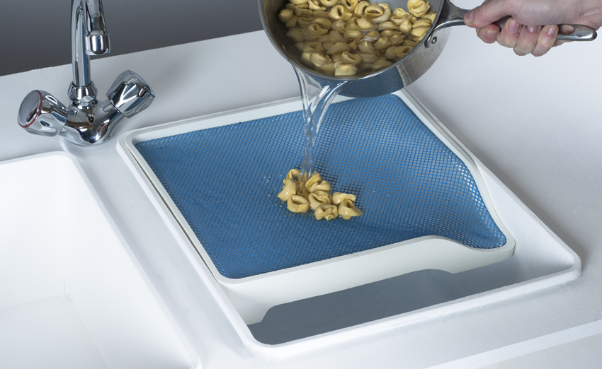 - Tendue à l'horizontale, la toile du cadre de l'évier se creuse progressivement au contact des aliments, les faisant ainsi converger au centre de l'objet.
